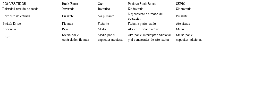 Este dispositivo permite realizar la conexión entre el grupo generador (panel - batería FV) y el resto del sistema. Además de tener en cuenta las condiciones climáticas, para extraer la máxima potencia de un panel FV, el sistema de conversión de energía se debe llevar al Máximo Punto de Potencia (MPP). Para el caso del convertidor DC/DC, el regulador ajusta la Ri del panel FV para que sea igual a la RMPP [19]. La Tabla 3 presenta una comparación entre algunos convertidores que podrían realizar la función de regulador de carga.