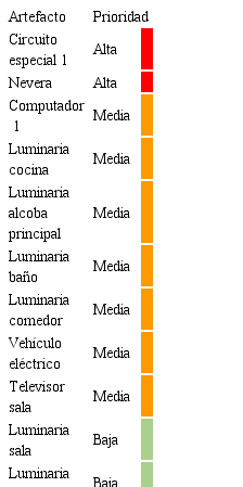 Esta información fue recopilada a partir de la encuesta realizada por los autores, en donde se le suministró al encuestado un listado de los dispositivos que se encuentran usualmente en una vivienda y se les preguntó cuál o cuáles priorizarían para el suministro de energía en caso de presentarse racionamiento de la misma. Como resultado se obtuvo una clasificación de 11 cargas de prioridad baja (CB), 7 de prioridad media (CM) y 2 de prioridad alta (CA), como lo muestra la Tabla 4.