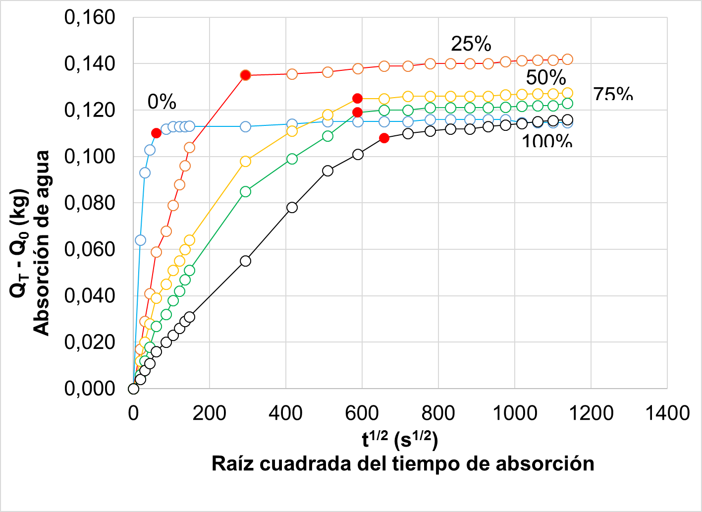 Además, la velocidad de absorción capilar S (m/s1/2) se estimó según la norma ASTM C1585-04 [18], como la pendiente de una recta entre el origen y el punto crítico de saturación en la gráfica definida por la ecuación (4),