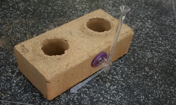 La penetración del agua en los bloques se estima por medio del RILEM CPC 11.2 [23]–[25](ver Fig. 6). Luego de garantizar que la superficie de los bloques está seca y limpia se aplica masilla impermeable para adherir una pipeta de Kasrten de 1 cm2 de sección transversal y un volumen de 5 cm3 [15], verificando que no haya fugas. El ensayo se desarrolla durante 10 minutos, registrándose la penetración del agua durante este periodo (ver Fig. 7).