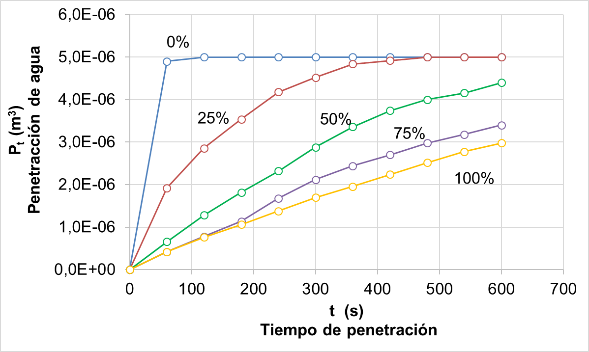Fuente: autores.En el eje de las abscisas se presentan los valores de Tiempo de penetración t (s) y en el eje de las ordenadas los valores de penetración de agua en el tiempo t (m3).