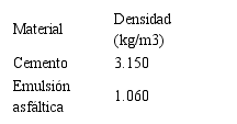 Dichas muestras (probetas y bloques) se fabricaron con tierra (proveniente del Municipio de El Retiro en el Departamento de Antioquia), cemento Portland tipo 1 (Argos), emulsión asfáltica en frío (Emulsion Asfáltica Sika®) y agua. En la Tabla 1 (Ver Tabla 1.) se presentan las densidades del cemento Portland tipo 1 y la emulsión asfáltica.