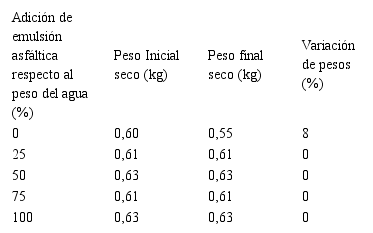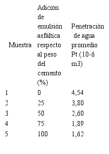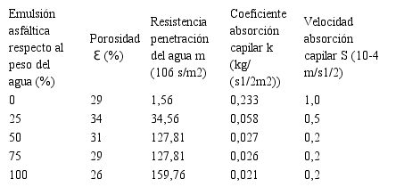 En la Tabla 4 se presentan los resultados de porosidad, resistencia a la penetración del agua, coeficiente de absorción capilar y velocidad de absorción capilar, para cada una de las proporciones de adición de emulsión.