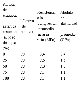 Mediante análisis experimental se encuentra que la proporción de mezcla óptima para la fabricación de BTC con emulsión asfáltica es del 50 %, ya que permite mantener condiciones aceptables de resistencia a la compresión de los bloques (2,3 MPa) y garantiza valores bajos del coeficiente de absorción capilar (0,027 kg / s1/2 m2) aunque no sean considerados hidrófugos [14]. Cuando la proporción de adición es del 75 % se disminuye en un 9 % la resistencia a la compresión y en 4 % el coeficiente de absorción capilar, lo cual indica que para aplicaciones que no demanden altas resistencias del BTC podría ser una alternativa de mezcla.