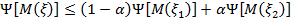 La construcción de diseños óptimos se basa en la optimización de alguna función de valor real de la matriz de información Ψ(ξ)≔Ψ(M(ξ)). La estructura de dicha función es conocida como criterio de optimalidad [4]. Los criterios de optimalidad de interés son aquellos que tienen alguna interpretación estadística. Una de las características importantes que debe cumplir un criterio de optimalidad es la propiedad de convexidad; es decir, si M(ξ)=(1-α)M(ξ1 )+ αM(ξ2) , con ξ1 y ξ2 diseños, entonces, para cualquier 0 ≤ α ≤ 1, se cumple la desigualdad dada en la ecuación (4):