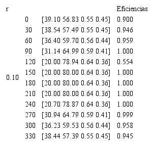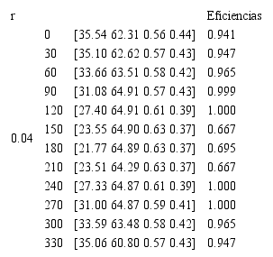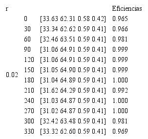 Al realizar las perturbaciones con un radio r = 0.04, ver Fig. 3, se obtienen eficiencias cercanas al diseño óptimo, la menor eficiencia en este caso es de aproximadamente 70 %. En la misma figura se observan las eficiencias obtenidas para los otros radios, r, se puede ver que para los radios 0.04, 0.06 y 0.08 las menores eficiencias se obtienen en el segundo cuadrante del plano cartesiano, ángulos entre 90° y 180°.