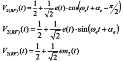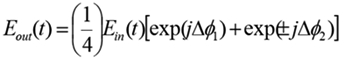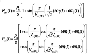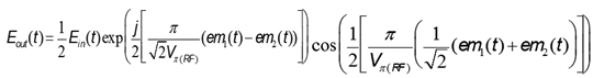 Note that the exponential and cosine of the argument are zero for one of the two expressions (em1 or em2) when there is a 90° phase shift between them, thus a single-sideband modulated signal is obtained. The expression for the optical output power is based on (8) and given by (9).