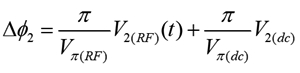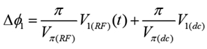 In turn, the terms of the phase variation ϕn depend on the bias voltage V∏. Such value is defined as the voltage applied to the electrodes of the device that causes a phase change of 180° in the optical signal that propagates in the waveguide. Likewise, VRF represents the voltage amplitude in the RF inputs (upper and lower). Therefore, the phase variation as a function of these voltages can be expressed by (2) and (3):