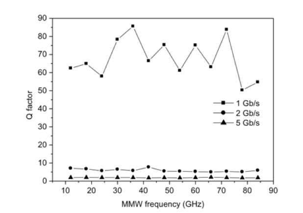Finally, in order to characterize the quality of the obtained signal as a function of the frequency in millimeter band and transmitted bit rate, the system was modeled using OptiSystem. This simulation software assessed the behavior of the proposed architecture between 12 GHz up to 84 GHz for transmission rates of 1 Gb/s, 2 Gb/s, and 5 Gb/s. As can be seen in Fig. 7, the quality factor of the signal decreases as a function of the transmission rate, but it remains constant as a function of the employed millimeter region. The significant penalties for transmission rates higher than 1 Gb/s are due to a higher level of intermodulation caused by the Composite Second Order (CSO) distortion introduced by the non-linear response of the modulator.