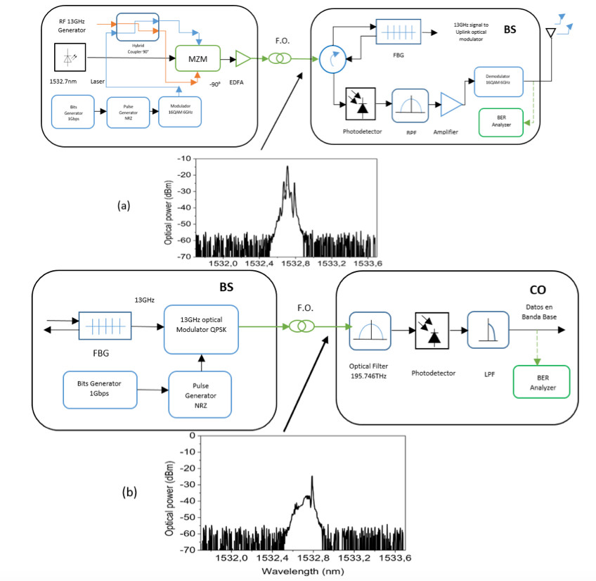 This is one of the reasons why cellular mobile networks continue their evolution from previous generations towards 5G, whose project (IMT-2020 and Beyond) developed by ITU-3GPP, started in 2012 with a time horizon of eight years [2]. Among the innovations this next generation will bring is the use of a new frequency spectrum called millimeter waves (MMW), whose range lies between 30 and 300 GHz [3]. This spectrum will mitigate current limitations imposed by the saturation of frequencies up to 5 GHz. The use of frequencies in the millimeter band is considered one of the cornerstones that will support the fronthaul segment in future 5G networks [4]. In this context, transmission techniques based on Radio over Fiber (RoF) emerged as a mechanism that allows the convergent transport and distribution of high frequency signals [5]. Said convergent process, in addition, has the great advantage of being able to use the current infrastructure of wireless networks, thus reducing costs and deployment times. This characteristic addresses the previously mentioned access needs and it offers alternatives for the provision of services (such as triple play), trends in cloud computing [6], Distributed Antenna Systems (DAS) [7] and, in general, an environment with a growing number of users. These subscribers demand quality in telecommunications services, and they essentially use fiber optics as transmission lines and radio systems to enable wireless access and mobility.