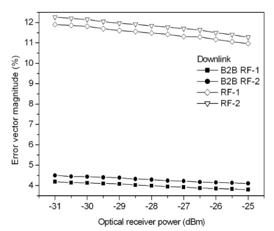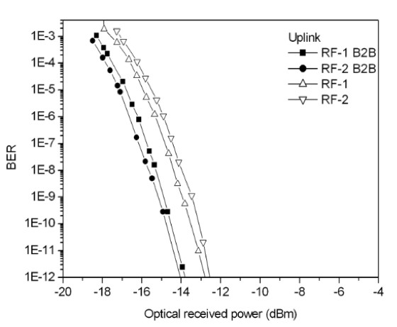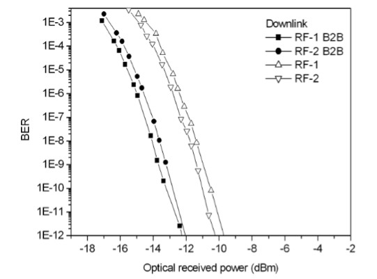 As far as the experimental demonstration is concerned, the Bit Error Rate (BER) performance of the 1-Gb/s service onto 6 GHz (RF-1) and 8 GHz (RF-2) showed penalties of approximately 2.3dB and 1.8dB, respectively, compared to the back-to-back curves. The EVM of the 16QAM service onto the same carriers was below 11% at -25dBm and 7% compared to back-to-back degradation. These measurements are satisfactory compared to the 3GPP standard, which indicates it should be lower than 12.5% for 16QAM digital modulation.