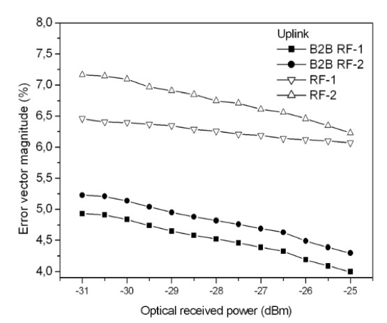 As can be noticed, the degradation of the uplink signals is caused by the crosstalk after the filtering process in the FBG, which results in remaining signals in the process of detection and down conversion. Nevertheless, it can also be observed that the results of the uplink signal are less penalized than those of its downlink counterpart. The uplink signals also satisfy the EVM limit, since acceptable values for QPSK services should reach a maximum EVM value of 17.5% [19].