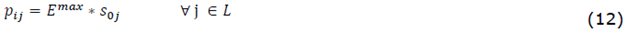 The set of constraints (8)-(13) represents the limitations of EVs when they cross a route of LCs. Constraints (8) and (9) guarantee the fulfillment of the distance balance constraint on a LC route, which is necessary for the calculation of the accumulated distance at the moment of crossing every arc (i,j) of the optimal solution. These equations are written in a similar way to the balance of power flow but, in this case, the balance is with the distance; that is, at each node (j ∈ L), the distance of the activated arc 𝑆𝑖𝑗 is concentrated in , similar to parameter D𝑗 A balance with variable 𝑝𝑖𝑗 ensures that the distance is accumulated, which is the same as variable 𝑙𝑖𝑗 Similarly, the constraints in (20) guarantee the fulfillment of the distance balance constraint over a BC route; (26) and (27) do the same for the set of vertices that are CPs.
