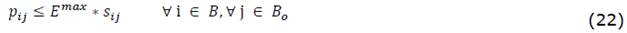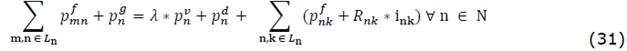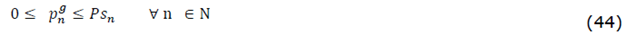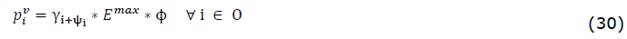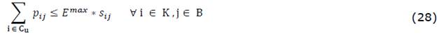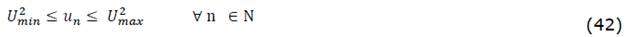 The constraints that represent the DN operation when batteries are recharged are presented in the set of equations (30)-(44). Constraint (30) is linked with (44), allowing a mapping between the physical nodes (j ∈ K) stored in variable yj and the electrical nodes (I ∈ O), to be recognized as demand points for vehicles with value (𝜙*E𝑚𝑎𝑥[W]), in the DN. Constraints (31) and (32) keep the balance of active and reactive power at each node (n ∈ N), considering the power generated at the node as well as the power that is taken and demanded from the node. Note, in both constraints, that the consumption of the vehicles is distributed with the factor (𝜆), according to the quantity of active and reactive power that is needed.