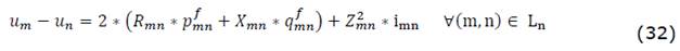 Constraint (32) represents the voltage drop in the network segment between the nodes (m,n). The set of constraints (33)-(40) is the linearization, with intervals of discretization, of the expression that relates the square of the apparent power with the summation of the square of active and reactive power. This linearization can be consulted in detail in [21]. In expression (33), the variable U𝑛o𝑚 is valid since the voltage drop lies within the range of the respective energy regulation law of the country. The relation on the right side of the equation is summation ()2 + (