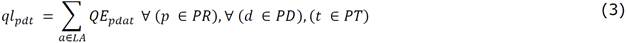 qlpdt= Cantidad de producto p que llega a la puerta de descarga d en el tiempo t.