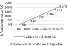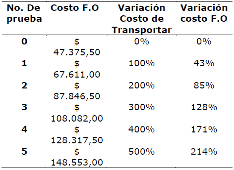 De los anteriores resultados, se puede identificar que a medida que el costo de trasporte se incrementa, se presenta un aumento en el valor de la función objetivo en una proporción menor al aumento del costo, ya que si se realiza un aumento del costo de 500 % el porcentaje de aumento de la función objetivo es de 214 % con un costo de $ 148.553,00 (ver Fig. 1).