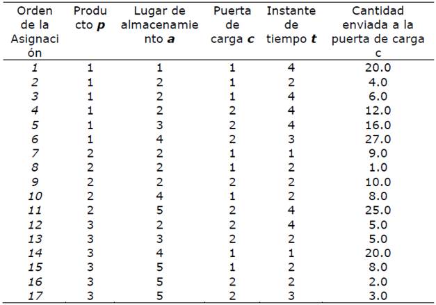 También se puede evidenciar la flexibilidad que tiene el modelo en cuanto a la entrada de productos por diferentes puertas en un mismo instante de tiempo tal como se muestran en el tercer y cuarto orden de asignación, en donde el producto 1 ingresa por la puerta 1 y por la puerta 2 en el instante de tiempo 2, sin embargo, éste se asigna al mismo lugar de almacenamiento, puesto que este cuenta con capacidad.