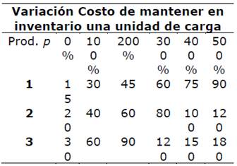 Consiste en variar el parámetro 𝑐𝑖𝑝𝑎 (costo de mantener en inventario una unidad de carga del producto p en el lugar de almacenamiento a) de manera positiva, mantenimiento fijo el parámetro clp (costo de transporte de una unidad de carga del producto p, por metro recorrido), para esta instancia se debe tener en cuenta que los costos de mantener inventario son diferentes por cada tipo de localización ya que el costo de mantener inventario en las tipo 2 es mucho menor que el costo de mantener inventario en las tipo 1.