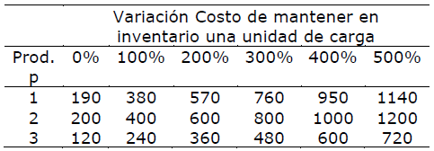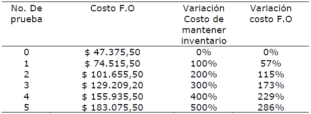 De la Tabla 15 se puede inferir que la variación del costo de la función objetivo se realiza en menor proporción que la variación del costo de mantener inventario, ya que, si se aumenta un 500 % el valor del costo de mantener inventario, la función objetivo presenta un aumento del 286 %con un costo de $183.075,50.