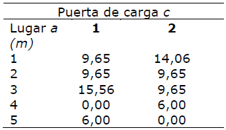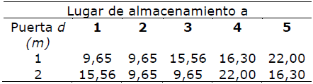 En las Tabla 2 y 3 se detallan los parámetros de las distancias 𝑙𝑒𝑑𝑎 y 𝑙𝑠𝑐𝑎, los cuales representan la distancia en metros desde la puerta de descarga hasta el lugar de almacenamiento y desde el lugar de almacenamiento hasta la puerta de carga respectivamente.