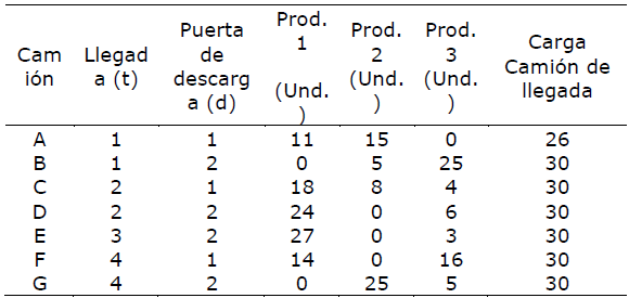 En las Tabla 4 y 5 se detallan las cantidades de cada tipo de producto que llegan en los camiones de entrada y se despachan en los camiones de salida. Tanto los camiones de entrada como los de salida tienen una capacidad de treinta (30) pallets y por lo general contienen más de 2 tipos de producto.