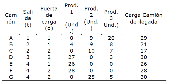 De la misma manera en la Tabla 10 se registran las cantidades de cada uno de los productos p que fueron transportados a las puertas de carga según los requerimientos de salida en los diferentes instantes de tiempo, ratificando una vez más el cumplimiento de la capacidad de cada uno de los lugares de almacenamiento y la equivalencia entre las unidades de carga que ingresan a la terminal y las que salen.