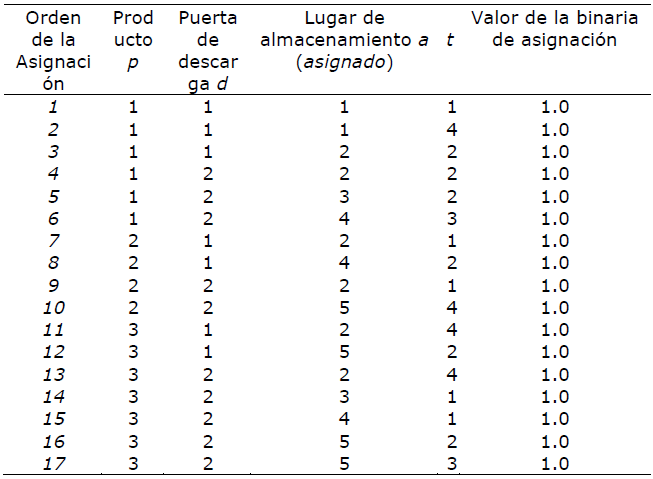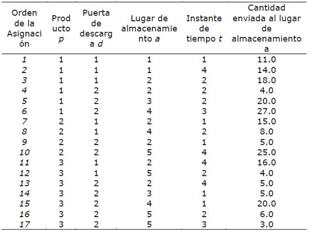 En la Tabla 8 se pueden ratificar los supuestos descritos anterior mente, entre ellos el que a un lugar de almacenamiento sólo se le puede asignar un tipo de producto en un instante de tiempo, pero un producto sí puede ser asignado a varios lugares de almacenamiento debido a las limitaciones de capacidad de cada uno de los lugares, cumpliendo con la función objetivo.