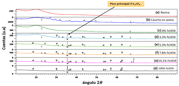 A partir de los difractogramas queda en evidencia que la resina, ripio de llanta en polvo y la magnetita nunca reaccionan entre sí conformando una nueva fase y por ende no se observan nuevos picos de difracción [13].