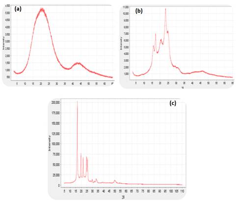 En muchos casos, no tenemos una estructura de cristal disponible, el estado de la materia puede inferirse de la apariencia del patrón. En la Fig. 2c, los patrones de polímero consisten en múltiples picos agudos consistentes con la «difracción» de una red cristalina. En la Fig. 2a, los patrones tienen características muy amplias consistentes con la «dispersión incoherente» de un sólido amorfo. Los patrones de la Fig. 2b son más complejos, exhibiendo una mezcla por lo cual el material se comporta como un material semi-cristalino [14]. Con base a lo anterior, se puede decir que al mezclar la resina epoxi con el ripio de llanta en polvo, la difusión es muy completa, es decir, todo lo que era cristalino en el ripio de llanta se difundió y se transformó en amorfo (ver Fig. 1a y 1b).