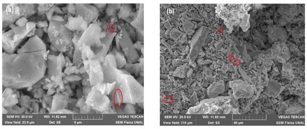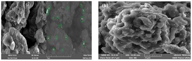 Cabe recalcar que se presentan partículas brillantes dentro del material, como se observa en la parte derecha de la imagen de la Figura 3a, las cuales, de acuerdo con la caracterización por fluorescencia, se sugiere que están constituidas por hierro. Dichas partículas son consideradas impurezas, debido a que en la literatura no se encuentra reportado que el caucho pulverizado procedente de llantas en desuso posea estas partículas, por lo cual un posible origen de estas partículas se encuentra en el proceso de obtención del caucho en polvo, debido a que el método es mecánico. De manera que en el desarrollo de molienda pudo haber contacto con el enmallado que poseen las llantas y de esta manera quedaron elementos de hierro en el caucho obtenido en forma de polvo.