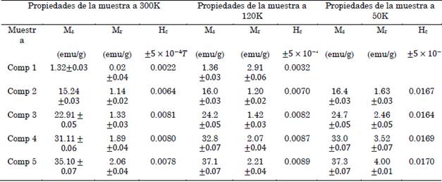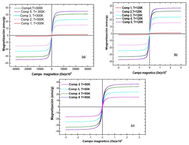 A las muestras Comp 1, Comp2, Comp 3, Comp 4 y Comp 5 se les realizó curvas de histéresis magnética a 50 K,120K y 300K, bajo la aplicación de un campo magnético externo comprendido entre -30000 Oe y 30000 Oe.