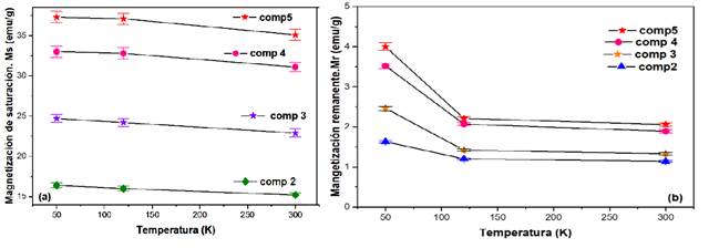 Además, se debe anotar que las curvas de histéresis para las muestras a diferentes temperaturas manifiestan que los compuestos son materiales magnéticos blandos, debido a que poseen ciclos de histéresis estrechos con pequeñas fuerzas coercitivas (ver Fig. 6).