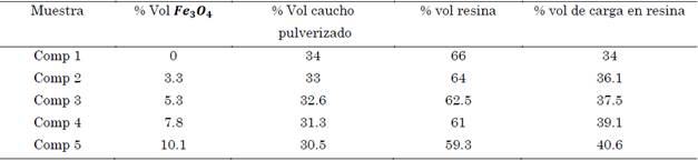 Para la elaboración del compuesto se emplea resina epoxi como matriz polimérica, la cual previamente fue mezclada con 2 % de catalizador en peso de resina, con el fin de iniciar una reacción química que conlleva a un proceso de curado. El porcentaje de catalizador usado en la matriz polimérica se determinó por medio de experimentos previos, los cuales evidenciaron que este porcentaje en peso era el adecuado para la fabricación de los compuestos. Posteriormente, dicha mezcla entre catalizador y resina es reforzada con dos materiales: caucho pulverizado procedente de llantas en desuso y, como relleno magnético, magnetita pulverizada (Fe3O4 ). Como regla general, conviene mantener lo más bajo posible el contenido de carga en la matriz polimérica [10], por lo cual se utilizó un porcentaje en volumen de carga que se acoplara a esta condición como se observa en la Tabla 1.