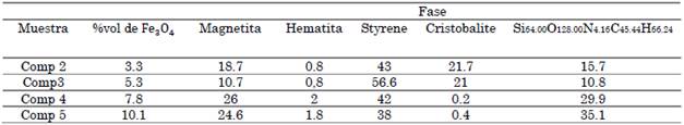 Los compuestos presentaron cinco fases: cristobalita, styren, hematita, magnetita y por último la fase con fórmula química Si64.00O128.00N4.16C45.44H66.24. El método utilizado para determinar la estequiometria química de los compuestos como de los precursores fue a través de la comparación de las pdfs ubicadas en la base de datos COD_2013 por medio del software X´Pert Highscore plus elaborado por Panalytical B. V. Los porcentajes de las fases presentes en los especímenes fue determinado por medio de refinamiento Rietveld (ver Tabla 2).