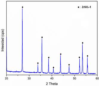 El difractograma del mineral es mostrado en la Fig. 2, se observan picos indicativos de un material altamente cristalino, compuesto en su totalidad por silicato de zirconio tetragonal. No se evidencia presencia de sílice libre, ni de las fases correspondientes a las impurezas mostradas en la Tabla 3, debido a su baja fracción en masa dentro del mineral.