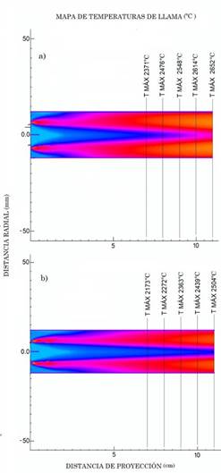 Los resultados del proceso de simulación realizado, indicaron que el calor de la llama producida a partir de una relación volumétrica de gases acetileno: oxígeno 1:1,7; correspondiente a una condición casi neutra sería insuficiente para propiciar la fusión de las partículas de silicato de zirconio de los rangos de tamaño estudiados (que son los comúnmente utilizados en proyección térmica), por lo que se optó por realizar simulaciones con llama oxidante y superoxidante; encontrando que a una distancia de proyección entre 7 y 11 cm (que es la frecuentemente empleada en proyección térmica de materiales cerámicos) la temperatura variaría entre 2371ºC y 2652 ºC para la llama oxidante . En el caso de la superoxidante, la temperatura varía entre 2173 ºC y 2504 ºC, ver Fig. 3. Así mismo, se encontró que para distancias de proyección de hasta 10 cm la temperatura de las partículas va en incremento, pero a partir de esta distancia el aumento de dicha temperatura no es significativo. Comparando el perfil de temperaturas de las llamas simuladas, encontramos que si bien la llama con relación oxidante alcanza una mayor temperatura que la producida con la relación superoxidante, la primera presenta una menor longitud en su zona de reacción primaria, la cual es la zona con mayor energía térmica, esta diferencia es de aproximadamente 1,1 cm de longitud [11], motivo por el cual, a 10 cm como distancia de proyección térmica, la llama superoxidante a pesar de presentar una temperatura máxima que es 175 ºC menor que la de la relación oxidante, puede suministrarle una mayor cantidad de calor a las partículas debido a su mayor longitud de zona primaria.