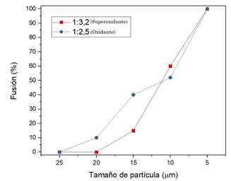 Esto coincidió con lo observado cuando las partículas fueron sometidas a la llama superoxidante. La cual, a pesar de tener una temperatura máxima de llama menor respecto a la llama generada con relación oxidante, permitiría fundir en mayor porcentaje las partículas con un tamaño menor o igual a 10 micras y fundir las partículas con tamaño menor o igual a 5 µm en igual proporción que la llama oxidante. Esto se debe a que según los resultados de estudios previamente realizados [11], la llama con relación superoxidante presentó una longitud de la zona de reacción primaria que es 1,1 cm mayor que la llama con relación oxidante, lo que permitiría un mayor tiempo de residencia a las partículas en esta zona y por consiguiente un aporte energético que compensaría el gradiente de temperatura existente entre ambas llamas para una distancia de proyección de 10 cm.