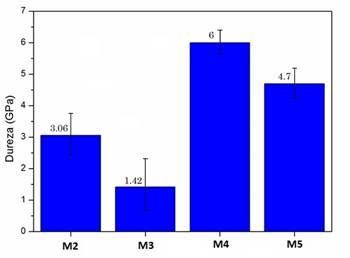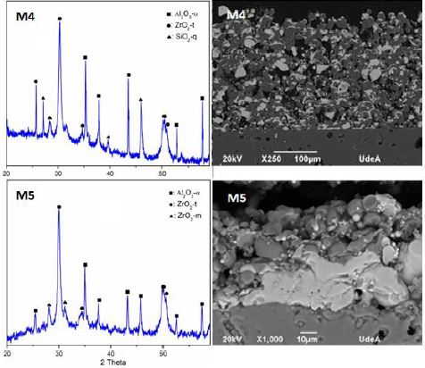 Por otra parte, los recubrimientos M4 y M5 elaborados con adición de un 50 % en peso de alúmina presentaron mayores valores de dureza que las demás muestras (M2 y M3), gracias al contenido de alúmina alfa, que es mucho más dura que las fases de la circona [25], [26], no obstante, en el recubrimiento M5 la dureza fue afectada negativamente por la alta porosidad presente en esta muestra.