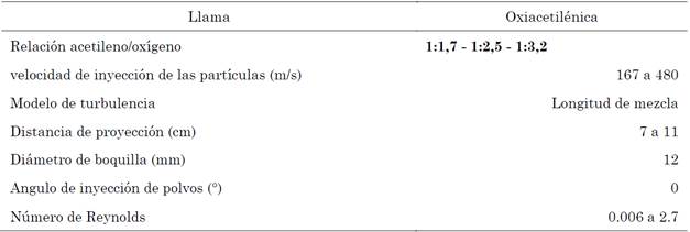 Tres condiciones de proyección térmica identificadas inicialmente a partir de estudios preliminares [11] fueron simuladas con la herramienta computacional Jets & Poudres SPCTS versión 2002-2009, con el fin de conocer el efecto de las variables de estudio (relación oxígeno-acetileno, distancia de proyección y tamaño de partícula, sobre la capacidad de la llama oxiacetilénica para fundir las partículas a depositar. Para ello se tomaron las condiciones mostradas en la Tabla 1.