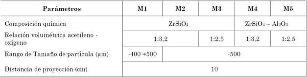 Con el fin de evaluar la posibilidad de mejorar el grado de compactación de los recubrimientos, el silicato de zirconio fue mezclado con 50 % en peso de polvo de alúmina de referencia comercial Oerlikon Metco 105 SFP, cuya composición química es 99,7 % en peso de alúmina (Al2O3), su única fase cristalina es Al2O3-( y su distribución de tamaño de partícula es d10=6,9 (m y d90= 25,5 (m. Las características fisicoquímicas de este material han sido ampliamente evaluadas en estudios previamente realizados [10]. La cantidad de alúmina adicionada al silicato de zirconio fue seleccionada de acuerdo con estas características fisicoquímicas.