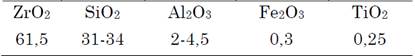 En la Tabla 3 se muestra la composición química del mineral suministrada por el proveedor del material. La composición química es coherente con los rangos en los cuales se encuentra comúnmente los silicatos de zirconio respecto a su relación circona/sílice [16]. La presencia de óxidos de titanio, hierro y aluminio tendrían un efecto a nivel local sobre la temperatura de disociación del silicato de zirconio y además por su menor punto de fusión contribuirían a los procesos de sinterización del material [17].