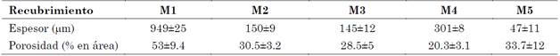 Los recubrimientos M2 y M4 presentan las mejores características estructurales de todos los recubrimientos obtenidos, lo cual es atribuido al mayor grado de fusión de las partículas que lo conforman.