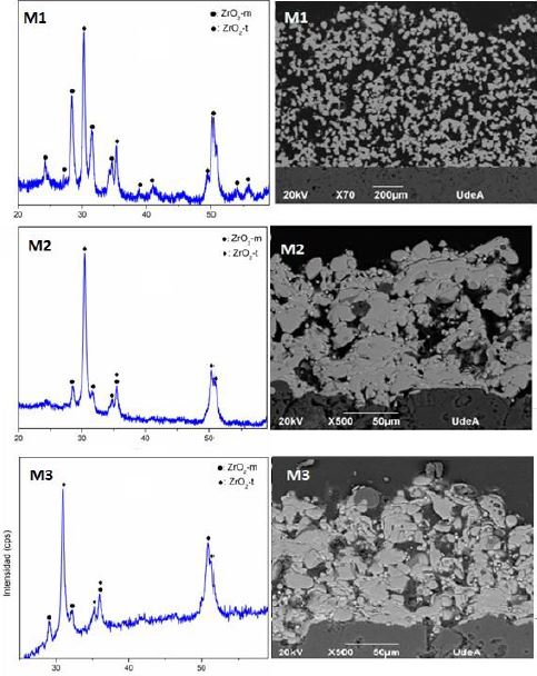 En los difractogramas de los recubrimientos no se observó picos correspondientes al silicato de zirconio, lo cual demostraría que bajo las diferentes condiciones de llama y distancia de proyección, las partículas alcanzaron temperaturas superiores a los 1673˚C, lográndose una disociación del silicato de zirconio en sílice y circona [17]. No se identificaron picos que indiquen fases cristalinas de la sílice proveniente de la descomposición del silicato de zirconio, excepto en el recubrimiento M4, lo que indica que en los recubrimientos M1, M2, M3 y M5, esta fase ha quedado amorfa.