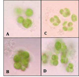 Moreover, microalgae cells were counted using a Neubauer chamber. Inoculum ratios of 1:1, 2:1 and 1:2 (for microalgae and bacteria, respectively) were evaluated. Here, 1 is equivalent to 100 µl and 2 equals 200 µl of inoculum. All cultures were monitored by light microscopy to analyze the interaction between the microalgae and the bacteria.