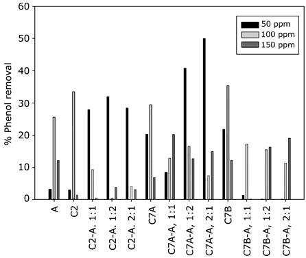 In general, it seems that high phenol concentrations negatively affect the synergy when microalgae are used; this was reflected in the fact that, in all the cases with 100 and 150 ppm, the phenol removal capacity of pure cultures is the same or higher than that of their consortia counterparts. Regarding the algae-bacteria ratio, our results confirm what was established without the presence of phenol, because the 2:1 bacteria-microalgae ratio displayed the most interesting removal capacity, especially the consortium Microbacterium spp-C. reinhardtii.