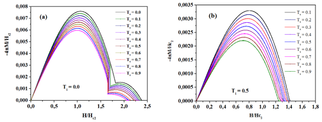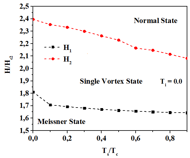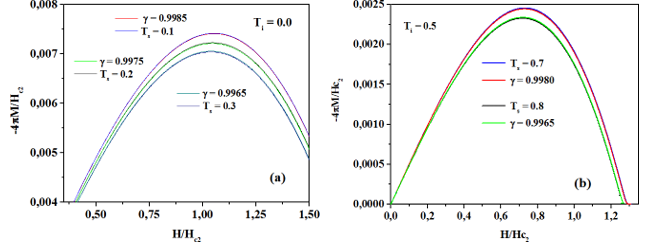 We analyzed the magnetization curves of the deGennes parameter in the single-vortex state using several values. Fig. 1 shows magnetization -4𝜋𝛭 as a function of applied magnetic field 𝛨 for a superconducting/vacuum interface in a single vortex state at 𝛵 = 0.0 (Fig. 1a) and Meissner state at Τ𝑖 = 0.5𝛵𝑐 (Fig. 1b). It is widely known that magnetization decreases as T𝑖 increases and the sample becomes less diamagnetic. It can be seen from the plots that the lower critical field 𝛨 ∼ 1.726𝛨c2 is practically independent of Ts, and the upper field depends on Ts (see Fig. 2). The Meissner state is presented for the case with Τ𝑖 = 0.5𝛵𝑐, and a slow superconductor/normal state occurs due to the temperature dependence with vortex size [2]. In Fig. 3, we plot magnetization as a function of 𝐻 for several values of 𝛾 and Ts. Fig. 3(a): T𝑖 = 0.0 and 𝛾 = 0.9985, Ts = 0.1 Tc, (red and blue lines), 𝛾 = 0.9975, Ts = 0.2T c, (green and black lines) and 𝛾 = 0.9965, Ts = 0.3 Tc, (dark cyan and navy blue lines). Fig. 3(b): T𝑖 = 0.5T c and 𝛾 = 0.998, Ts = 0.7 T c (red and blue lines), 𝛾 = 0.9965, (Ts = 0.8Tc green and black lines).