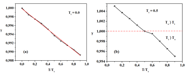 We calculated the error in the maximum difference of the magnetization curves by comparing all cases with 𝛾 = 1.0 and T𝑖 = Ts = 0.0. We thus found a percentual error 𝐸 ∼ 1% and, based on this criterion, we can say that the curves are very similar. We also established that 𝛾 presents an analytical dependence with 𝛵 = Ts, as 𝛾 (𝛵) = 09980 – 0.118𝛵 (see Fig. 3, left). In Fig. 4, we plot 𝛾 as a function of Ts when the magnetization curves are similar for Fig. 4(a)T𝑖= 0.0 and Fig. 4(b)T𝑖= 0.5 As we can see in Fig. 4(b), there is a deflection in the slope of 𝛾 (𝛵) when Ts ˃ T𝑖 from 𝛾 (𝛵) = 1.0062 – 0.0125𝛵 for 𝛾 ˃ 1.0 to 𝛾 (𝛵) = 1.0085 – 0.0150𝛵 for 𝛾 ˂ 1.0. This is due to a super conductor-superconductor (superconductor-metal) interface. The surface barrier is enhanced (suppressed) and, consequently,diamagnetism increases(decreases) andan interface with 𝛾 >1.0 (0 < 𝛾 < 1.0) must be chosen. Our resultsshow dependenceforthe critical temperature withthe boundary simulatedby the deGennes parameter b
