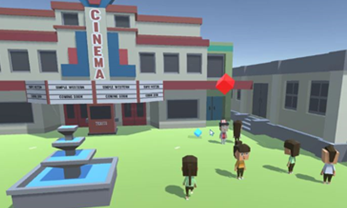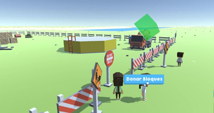 Una vez definidos dichos módulos, se definió la modalidad de juego, siendo un tipo sandbox [28] la elegida. Dicha modalidad, empleada en juegos mundialmente famosos como Minecraft [29], quiere decir, por una parte, que el juego consiste en una serie de desafíos que pueden ser completados de forma independiente; y por otra, que los jugadores pueden explorar libremente el ambiente en que están inmersos sin necesariamente una linealidad establecida y con la posibilidad de visualizar el resto de jugadores en tiempo real. Una imagen del juego donde puede apreciarse el ambiente y los jugadores, se presenta en la Fig. 1.