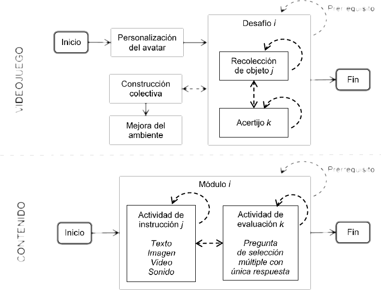 En la Fig. 4 se presenta, a manera de diagrama, una representación de la estructura general del juego que sirve, a su vez, para precisar la metáfora entre los contenidos educativos y los elementos del mismo.